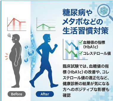 臨床試験では、血糖値の指標(HbA1c)の改善や、コレステロール値の適正化など、健康診断の結果が気になる方へのポジティブな影響も確認されています 。