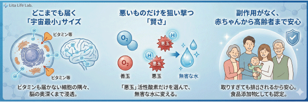 体の中には、免疫に必要な「善玉」の活性酸素と、細胞を傷つける「悪玉」の活性酸素があります。水素は、この**「悪玉」だけを選んで無害な水に変えてくれる**という、非常に賢い性質を持っています 。